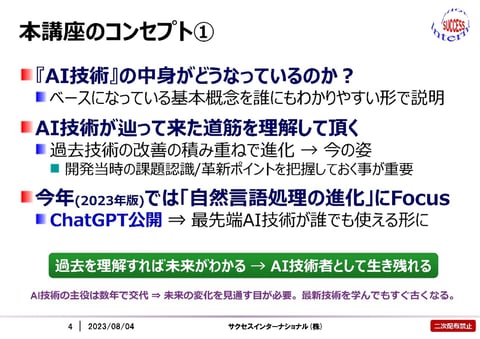 AIエンジニアを目指す方向けに最低限知っておくべきAI技術の基本概念、AI技術開発の歴史、AI実務導入を成功させるコツ、など幅広く解説する講座です。細かい数式は使わず分かりやすい解説図を使って概念レベルの説明中心で行います(AIの専門書を買ってみたものの何がスゴイのか良く分からなかった人に適した講座です)。